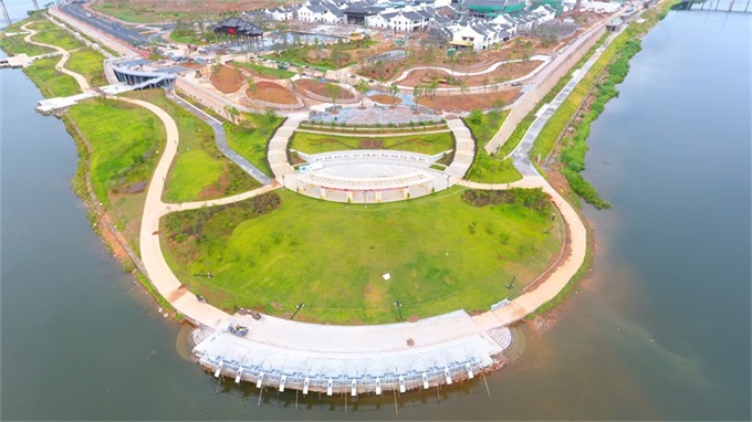 長沙圩鎮碧道鋪設了瀝青并劃分跑道和自行車道,“顏值”再獲提升。(林翔?攝)位于梅江河圩鎮段碧道沿線的紅色休閑廣場效果....